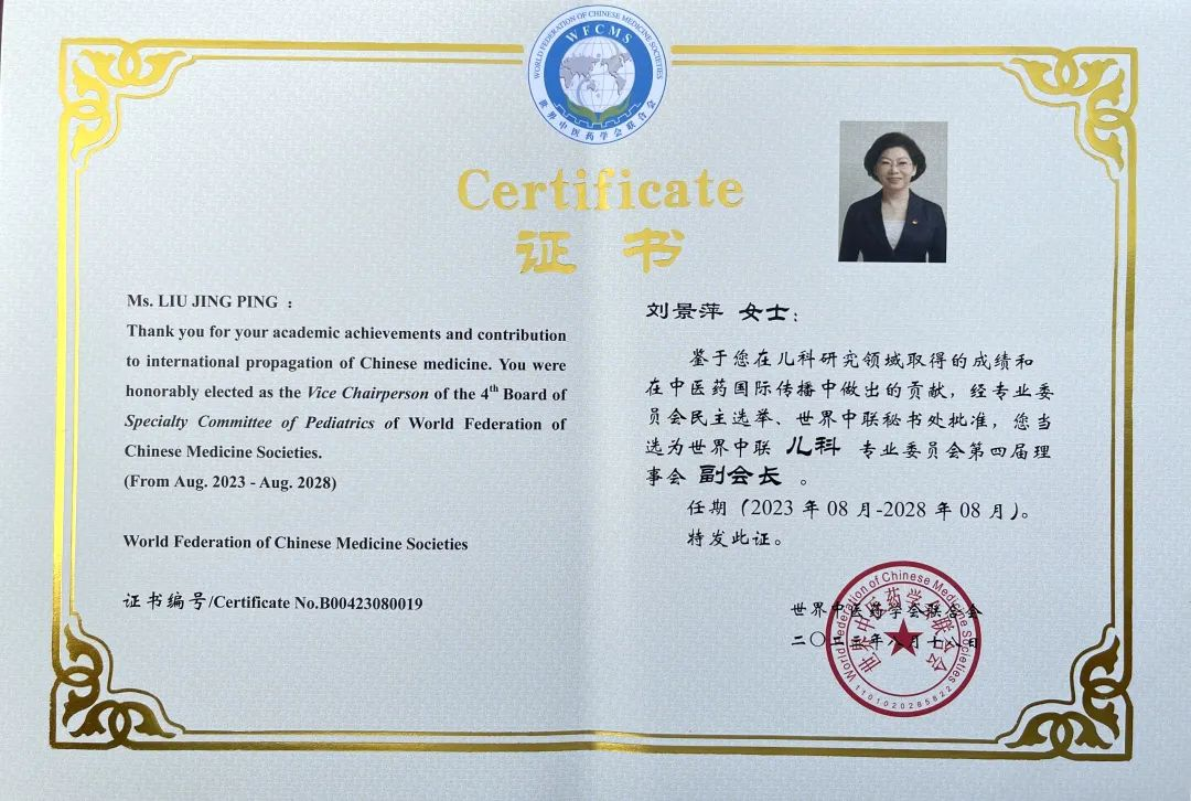 极速3D药业集团党委书记、董事长刘景萍当选世界中医药学会联合会儿科专业委员会第四届理事会副会长