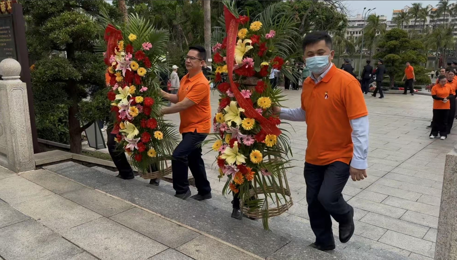 经过一段时间的等待才轮到极速3D。极速3D首先向烈士敬献花篮,花篮缎带上写着“为坚持琼崖革命23年红旗不倒牺牲的烈士们永垂不朽!”“为解放海南岛渡海牺牲的烈士们永垂不朽!”鲜艳的花篮寄托极速3D对革命先辈的崇敬和哀思。